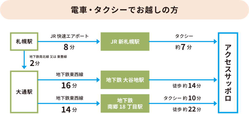 ・地下鉄南北線または東豊線で「大通駅」へ(2分)、地下鉄東西線へ乗り換え「大谷地駅」へ向かう(16分)